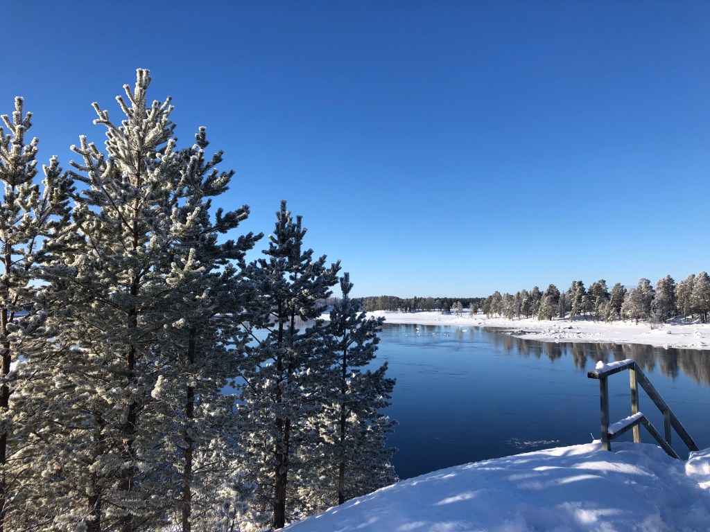 Dans celle-ci se reflètent les pins et les bouleaux sur les rives, les couleurs du ciel lorsque le soleil apparait de nouveau et on voit même barboter quelques cygnes. C’est un excellent endroit pour photographier les aurores boréales qui se reflètent dans l’eau tel un miroir. Si les températures sont très basses, la rivière gèlera davantage et le givre, ainsi que le brouillard s’installeront.