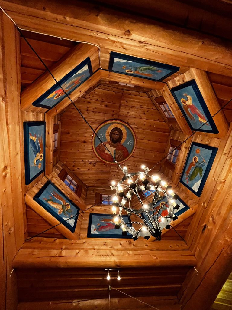 L’aspect extérieur nous décroche un « wouah ! » lorsque l’on aperçoit pour la première fois l’église, avec ses rondins de pins superposés, son clocher hexagonal tout enneigé et la croix orthodoxe qui domine au sommet. L’édifice est généralement fermé, mais si vous souhaitez voir l’intérieur, il faut se renseigner auprès d’agences d’activités ou d’hôtels qui proposent l’excursion.