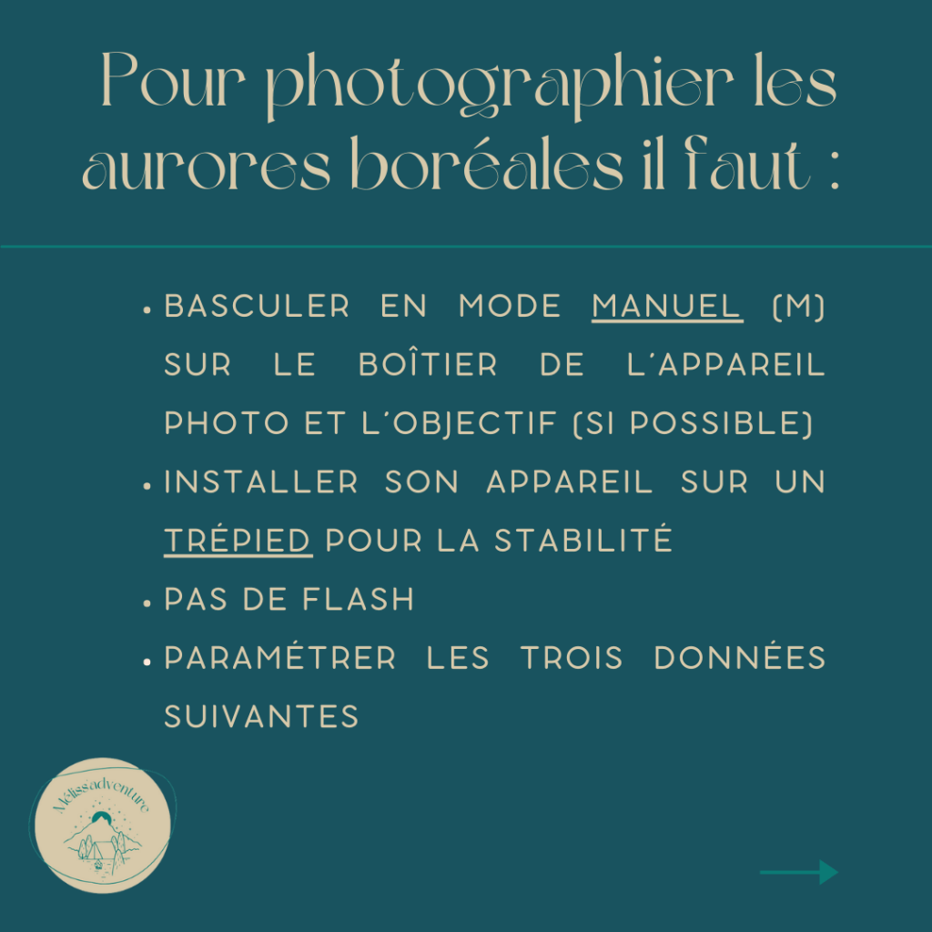 Pour les détails des réglages de l’appareil photo, je vous laisse découvrir le carrousel ci-dessous. Vous trouverez toutes les informations nécessaires à la réalisation de bonnes photos d’aurores. En plus de ces conseils, je vous recommande bien sûr de vous habiller correctement et de prendre un thermos avec une boisson chaude. Photographier les aurores demande du temps et il faut bien se préparer à passer plusieurs heures en extérieur. De même pour la batterie de l’appareil, pensez à en avoir une de rechange chargée pour continuer votre séance.