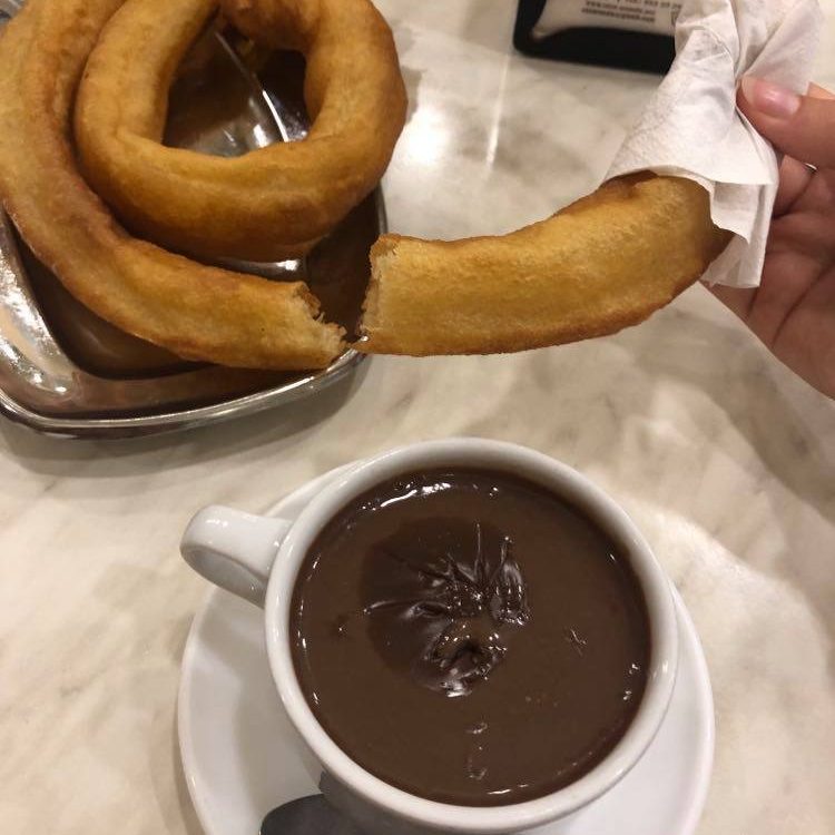D’autre part, vous avez le traditionnel « chocolate con churros » et vous trouverez plusieurs churrerias en ville, mais là on ne parle pas d’un chocolat chaud mais d’une vraie crème au chocolat pour faire tremper ses churros. Un pur délice ! Je vous recommande la Casa Aranda pour déguster ce petit-déjeuner ou goûter.