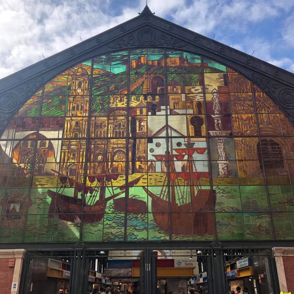 Le dernier lieu que je peux vous conseiller pour une petite balade et qui ravira vos papilles, c’est le marché Atarazanas dans le centre-ville. Autrefois, la mer arrivait à ses pieds et c’était un entrepôt à bateaux de l’époque nasride, dont il ne subsiste aujourd’hui que la porte centrale en marbre. Il a été conçu comme un marché aux halles bien plus tard avec une composition en 3 axes : lorsque vous entrez par la porte principale, l’allée du milieu est dédiée au poisson, celle de gauche à la viande et celle de droite aux fruits et légumes. A l’arrière du marché se trouve un magnifique vitrail représentant la ville de Málaga et ses atouts.