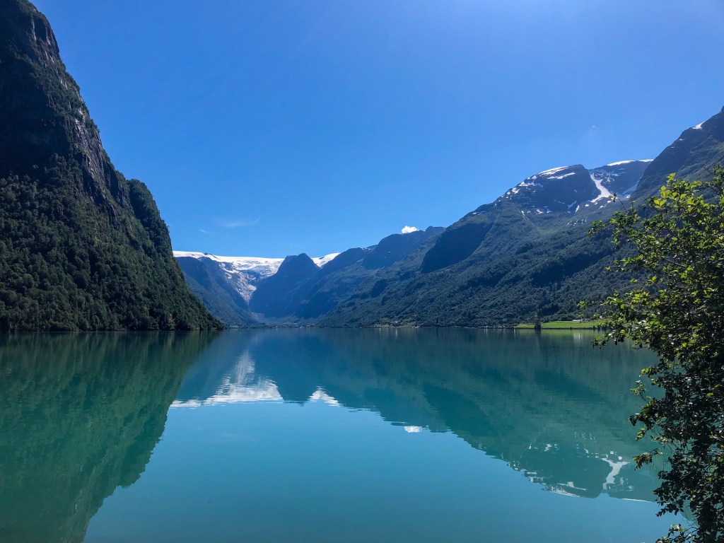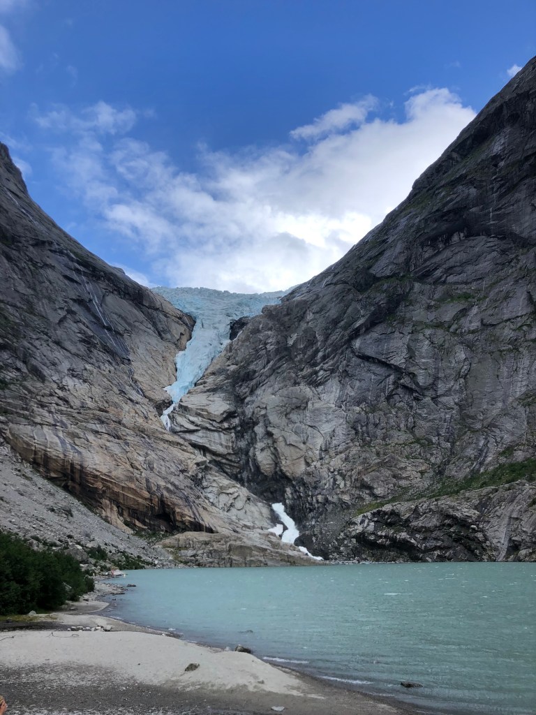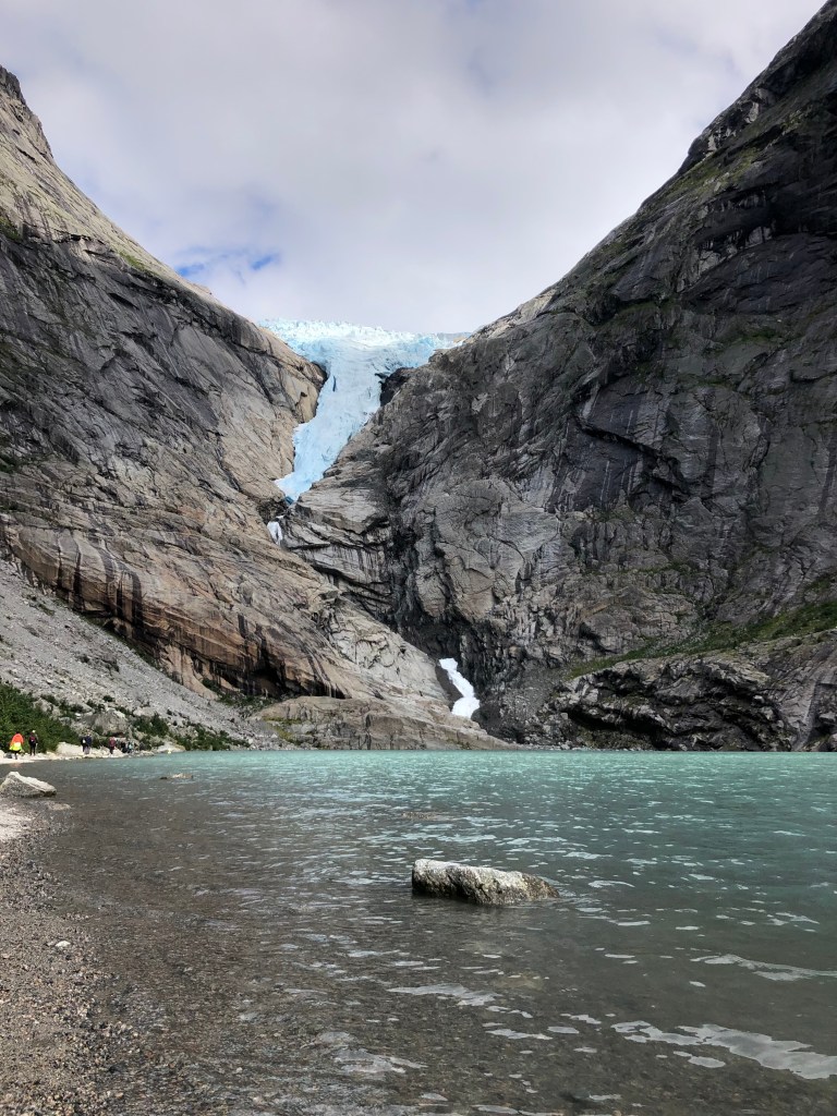Pour commencer avec un glacier facile à approcher en Norvège, je vous conseillerai celui de Briksdalsbreen, dans le parc national du Jostedalsbreen. Il faut parcourir 23 kilomètres dans la vallée Oldendalen qui mène au glacier de Briksdal, avant d’atteindre le parking. Il existe deux sentiers pédestres dont le plus court est de 5 kilomètres, donc environ 1 heure l’aller-retour. Sachant qu’à cause du réchauffement climatique les glaciers ont réduit de 11% en 30 ans, il est intéressant de rencontrer les panneaux sur le chemin qui montrent où arrivait le glacier il y quelques décennies ou siècles.