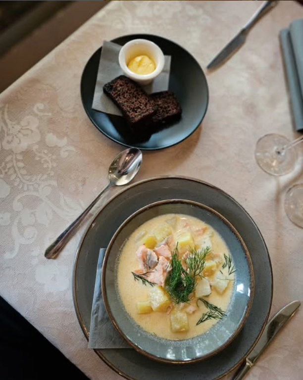 Le premier plat typique que je souhaite vous présenter – et le meilleur selon moi – est la traditionnelle soupe de saumon « lohikeitto ». Ce n’est pas qu’une simple soupe, puisqu’à l’intérieur vous retrouvez : des morceaux de saumon évidemment, des morceaux de pommes de terre, de l’oignon, du bouillon de poisson, de la crème fraîche, du beurre, poivre, sel et aneth. Dans certaines versions, on ajoute également de la carotte.