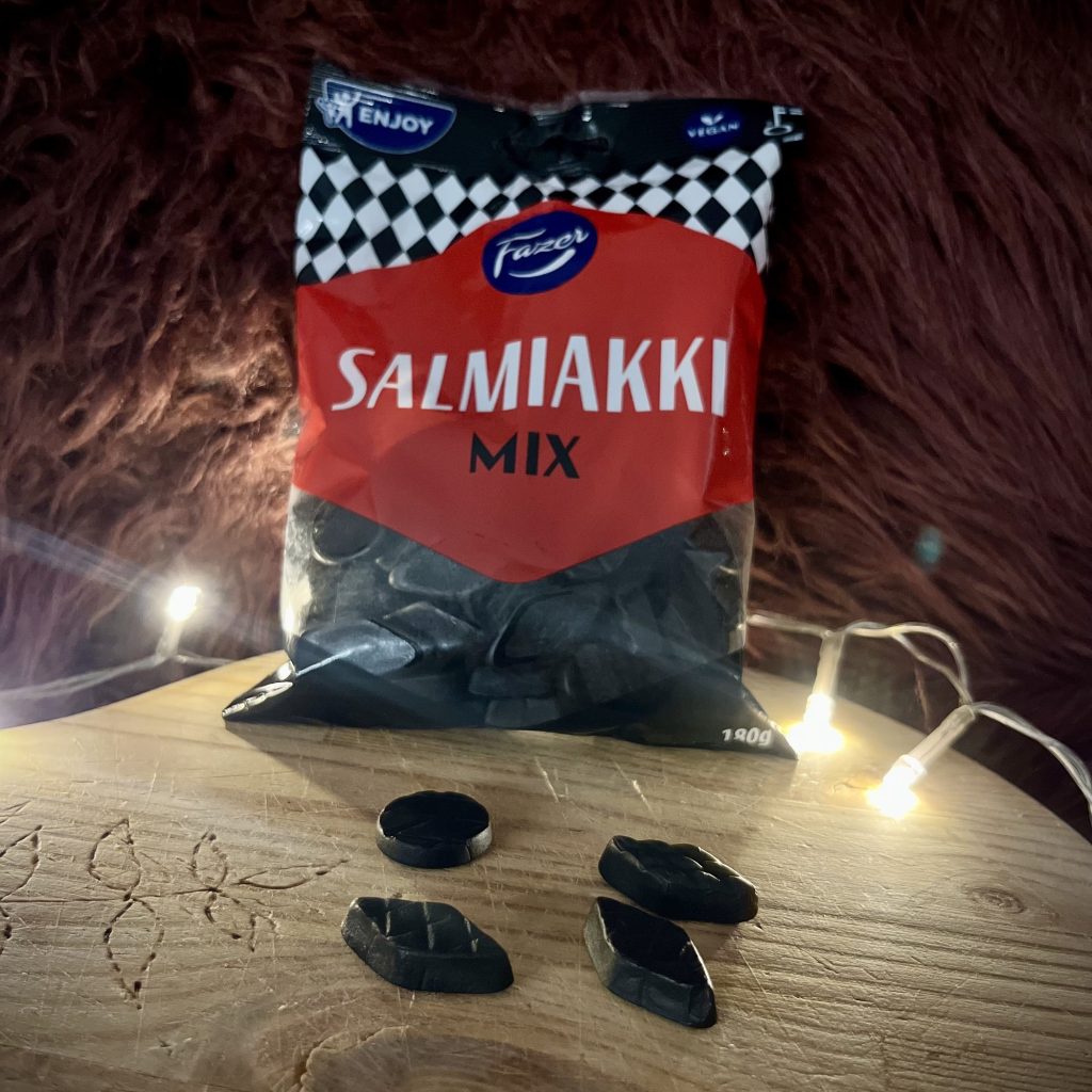 Pour finir mon top de la gastronomie finlandaise, je ne peux pas ne pas parler du « salmiakki » ou réglisse salée, qui a conquis le coeur des habitants des pays nordiques. Pourtant, c’est un sujet qui divise et je sais que certains d’entre vous ont tiré la grimace derrière leur écran rien qu’en lisant cela. Ici, en Finlande, on la retrouve généralement sous forme de bonbons, soit une gomme à mâcher enrobée de sel, soit comme un bonbon à laisser fondre sous la langue avec une capsule de sel à l’intérieur. Croyez-moi, il suffit d’une seule tentative pour savoir si vous aimez ou non, il n’existe pas d’entre-deux !