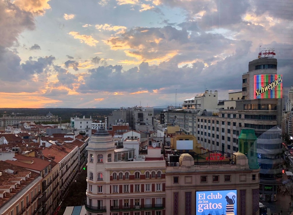 Si vous souhaitez vous délasser en fin de journée, je vous oriente alors vers les bars et rooftops de Madrid. Vous vous élèverez en hauteur afin d’apprécier les vues qui sont encore plus belles au coucher du soleil. Pour n’en citer qu’un seul et gratuit d’accès, vous pouvez vous rendre sur la terrasse du Corte Inglés Callao (grands centres commerciaux espagnols), au 9ème étage, afin d’admirer le panorama offert sur la fameuse tour Schweppes. A l’époque de mon voyage, une amie m’y avait emmenée et j’avais été hypnotisée par le spectacle des toits madrilènes. Cependant, nous n’avions pas testé le bar-restaurant qui s’y trouvait, donc je ne pourrai vous donner mon avis à ce sujet.