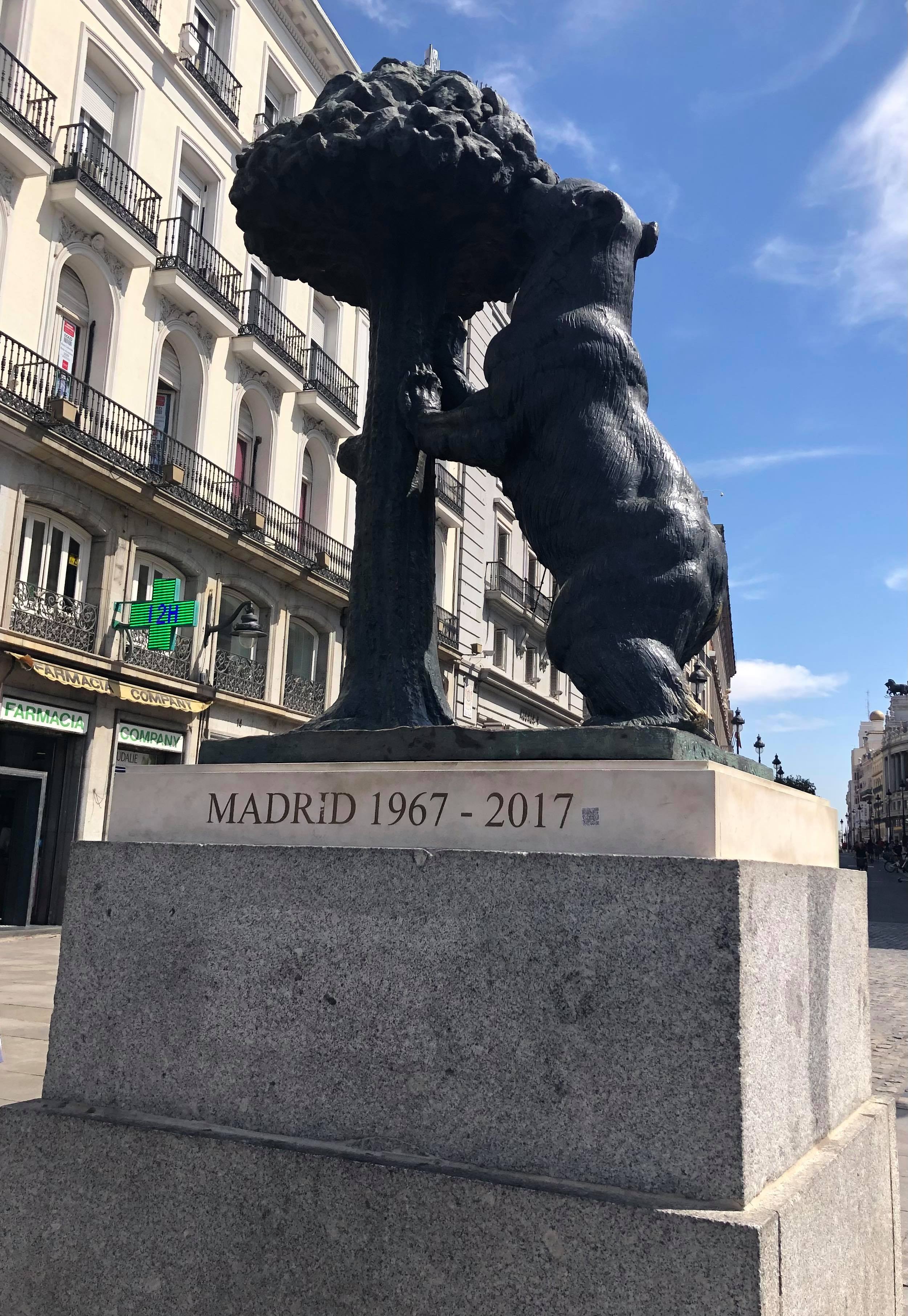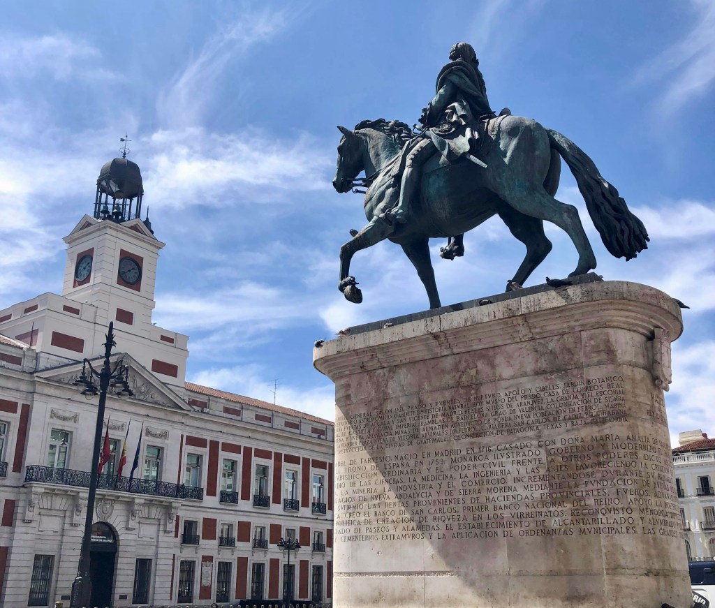 Commençons par la place centrale de Madrid, à savoir la Puerta del Sol, ou littéralement la Porte du Soleil. Cette place semi-circulaire était l’une des entrées du mur d’enceinte de la capitale espagnole au XVe siècle et reste l’un des lieux privilégiés de rassemblement des madrilènes depuis plusieurs siècles.