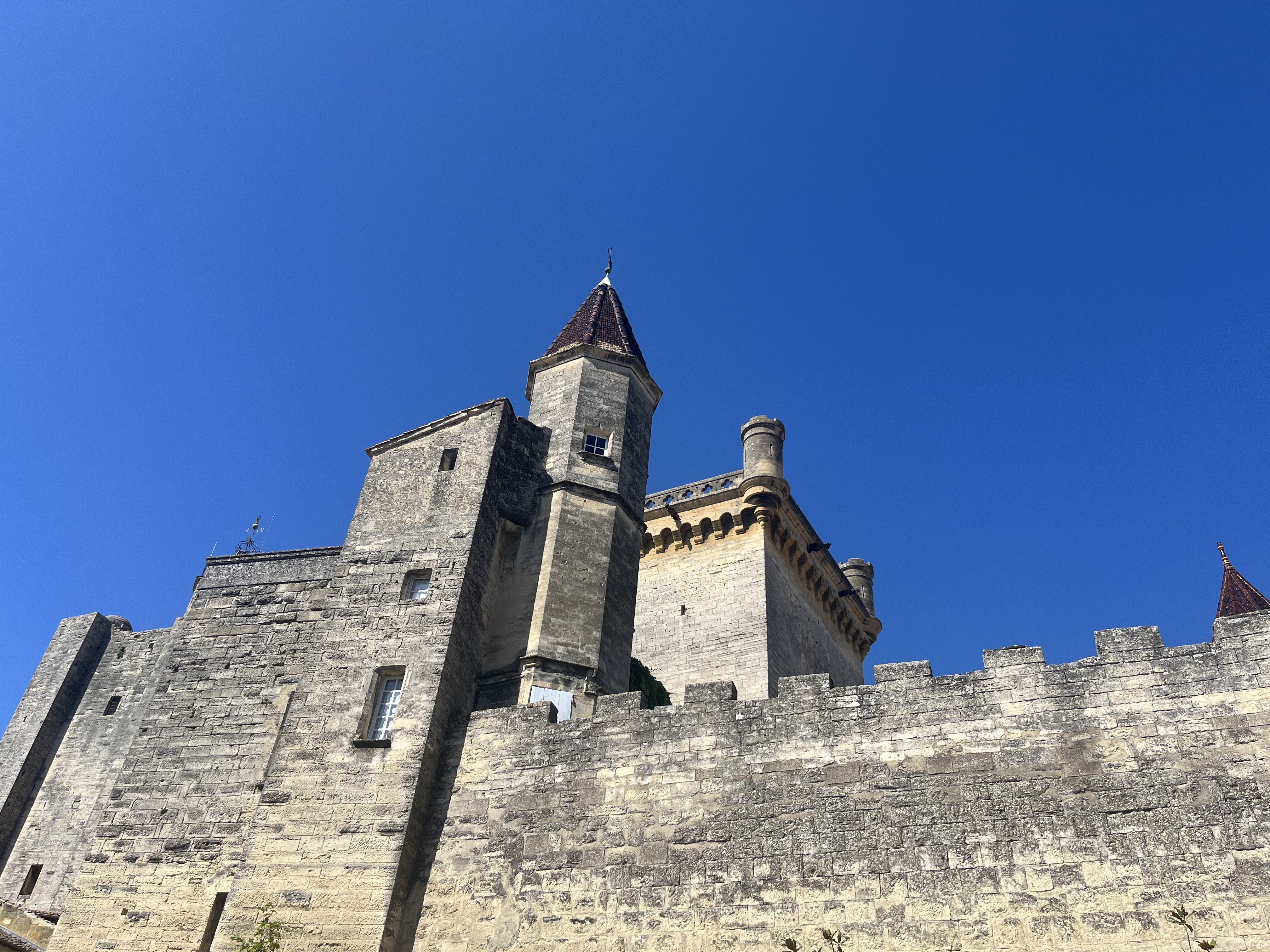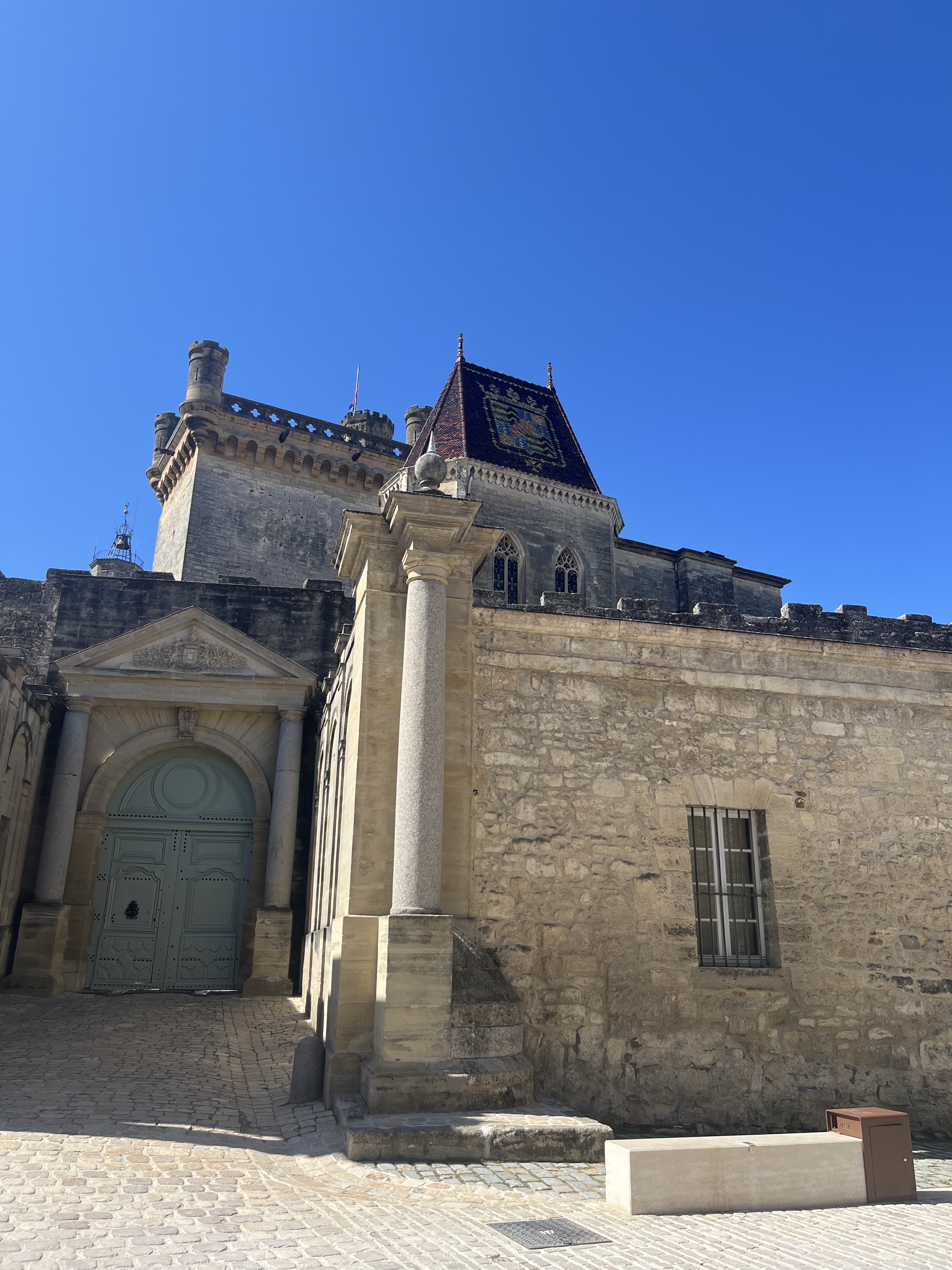 Pour nous placer au cœur de l’histoire médiévale d’Uzès, rien de tel que de se rendre dans l’hyper centre-ville où s’élève, sur des vestiges romains, le fameux Palais ducal ou Duché. Témoin du millénaire passé, ce complexe offre un panel d’architectures diverses et variées allant des trois tours fortifiées que sont la Tour du Roi, la Tour de l’Évêque avec son campanile et la Tour du Donjon du XIIe siècle, à la chapelle du XVIe siècle de style gothique flamboyant. On peut d’ailleurs noter sur le toit de cette dernière, la présence du blason du premier duc d’Uzès sur les tuiles vernissées.