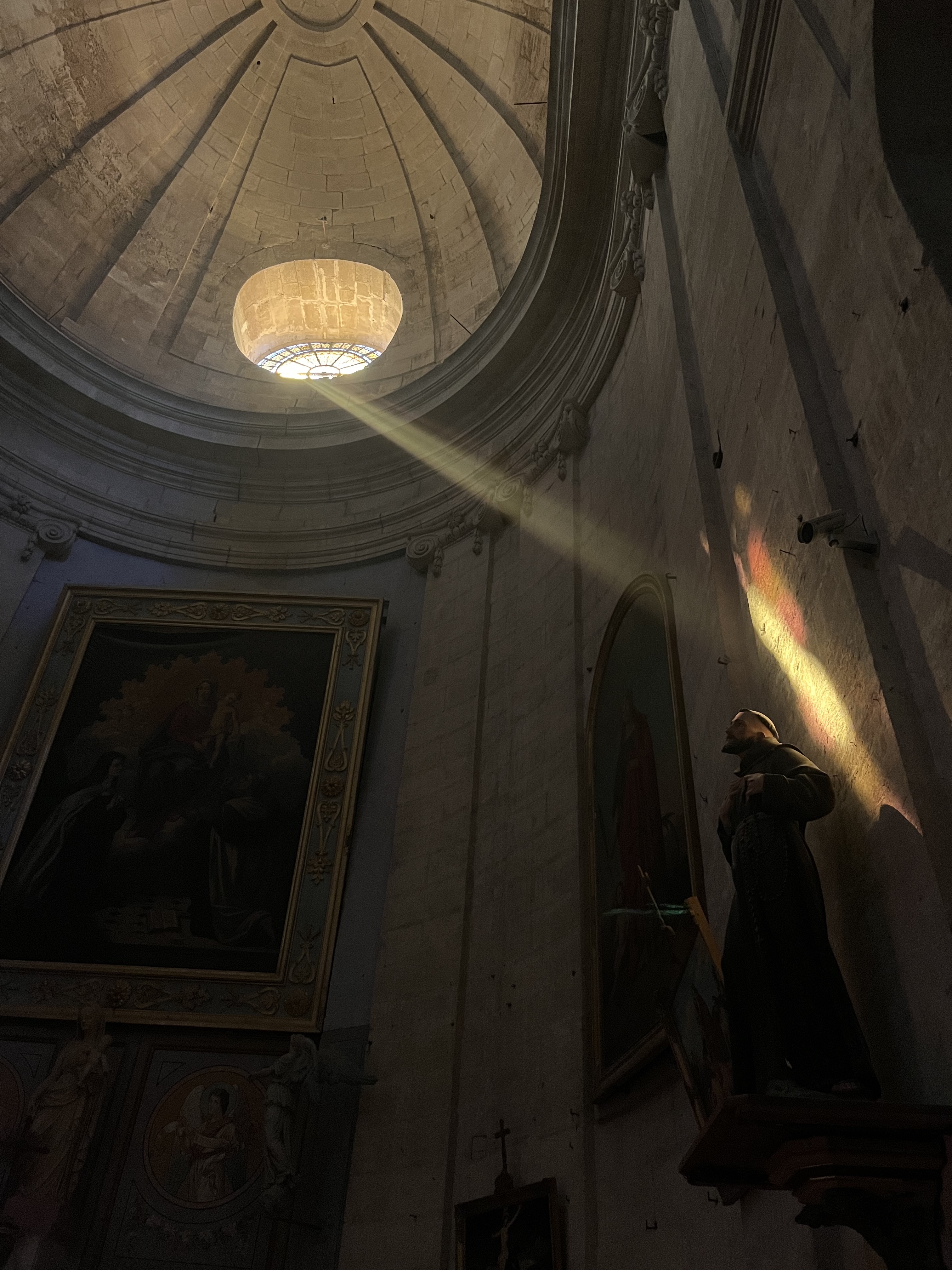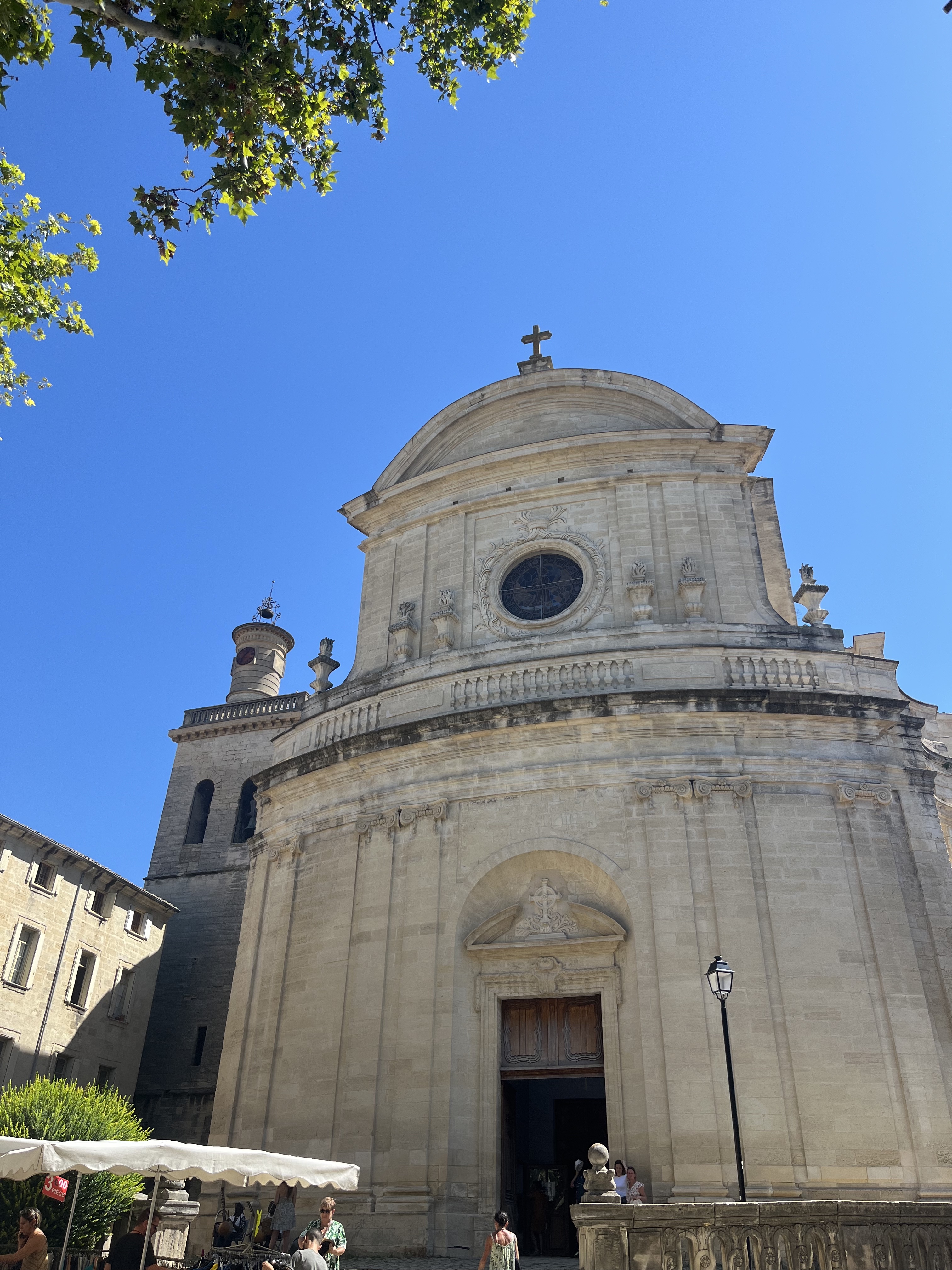 Parmi le patrimoine religieux uzétien, arrêtez-vous un instant devant l’église Saint-Étienne, construite au XVIIIe siècle dans un style baroque, sur le site d’une ancienne église détruite lors des guerres de religions. L’édifice se présente par une façade curviligne (et non ce n’est pas ma photo qui est déformée), décorée de pilastres ioniques, soutenant presque de fausses balustrades de pierre sculptées en bas-relief et ponctuées de 6 vases d’où jaillissent une flamme. A l’intérieur, c’est un monument à la pierre travaillée en courbes et en rondeurs qui frappe le visiteur, ainsi que la richesse du mobilier et décorations tout en dorures. Bien sûr, l’œil du passant est attiré immédiatement par le chœur, baigné de lumière venant des baies de la coupole : ce monument appelle à la contemplation. Afin de compléter votre connaissance du patrimoine religieux de la cité, ne manquez pas la cathédrale Saint-Théodorit d’Uzès, à 5 minutes à pied en longeant le Boulevard Victor Hugo.