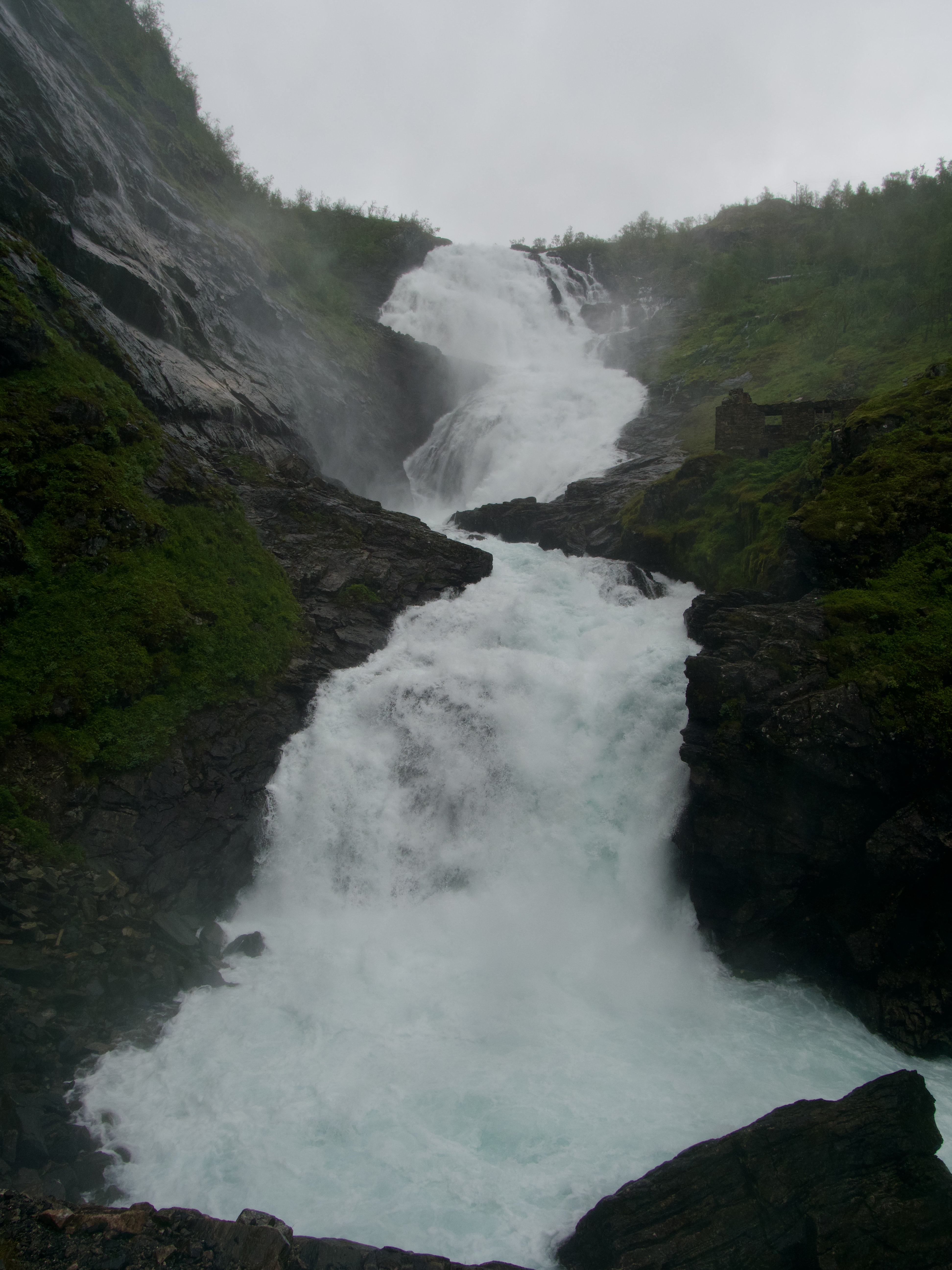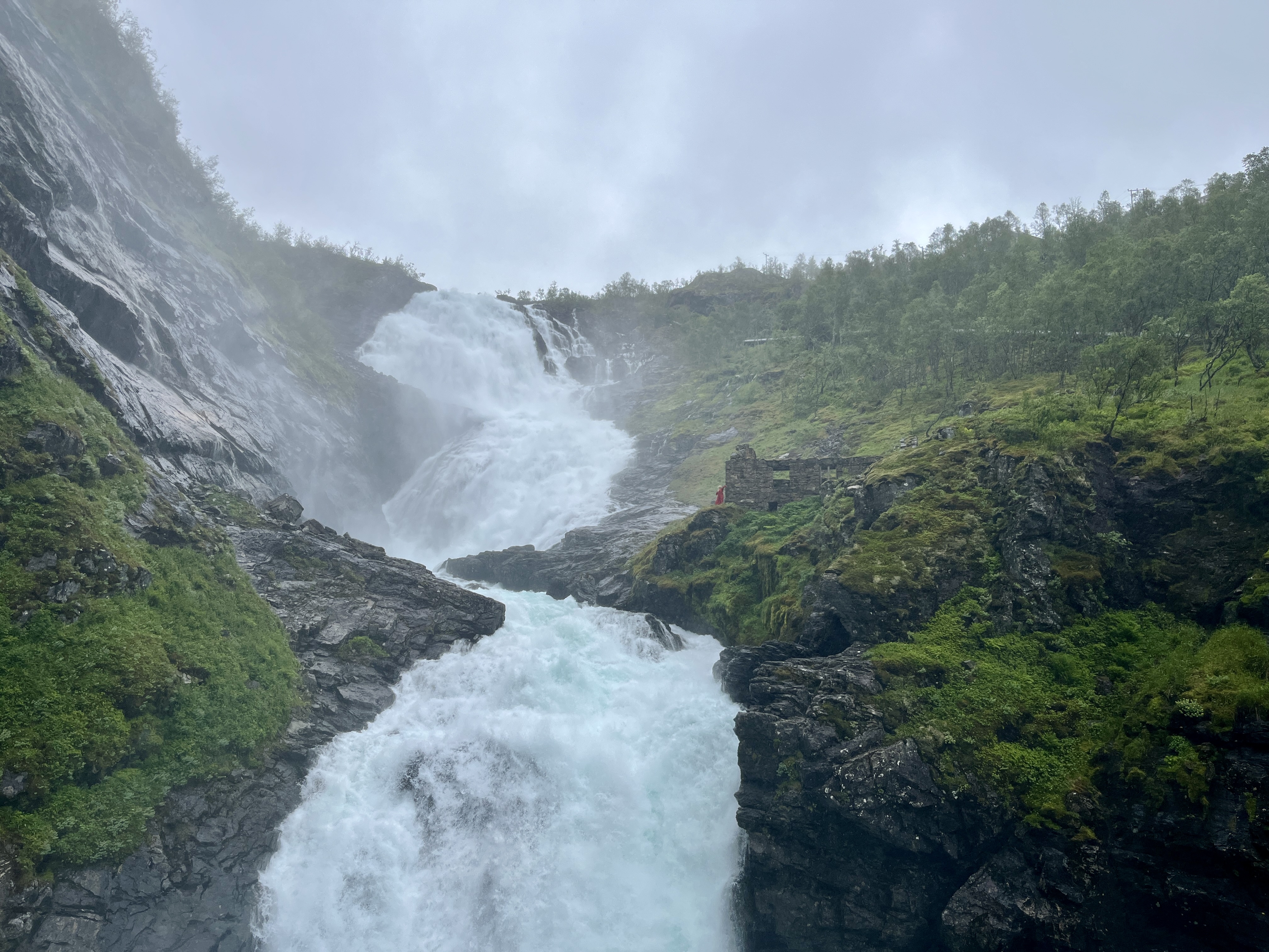 Le train a des allures dignes de l’Orient Express (ou du Poudlard Express). Pas de locomotive à vapeur, mais les voitures sont un peu old-school de l’extérieur comme de l’intérieur, sans pour autant être vétustes, bien au contraire ! Le train est très propre et soigné, les sièges en excellent état et on comprend pourquoi : la route est si belle que les passagers restent debout pour photographier d’un côté, puis de l’autre. Le trajet dure 1 heure et un arrêt est prévu à la cascade de Kjosfossen où l’on peut descendre 5 minutes, le temps d’immortaliser la chute et d’assister au mini-spectacle de danseuses sur fond musical devant ce paysage époustouflant.
