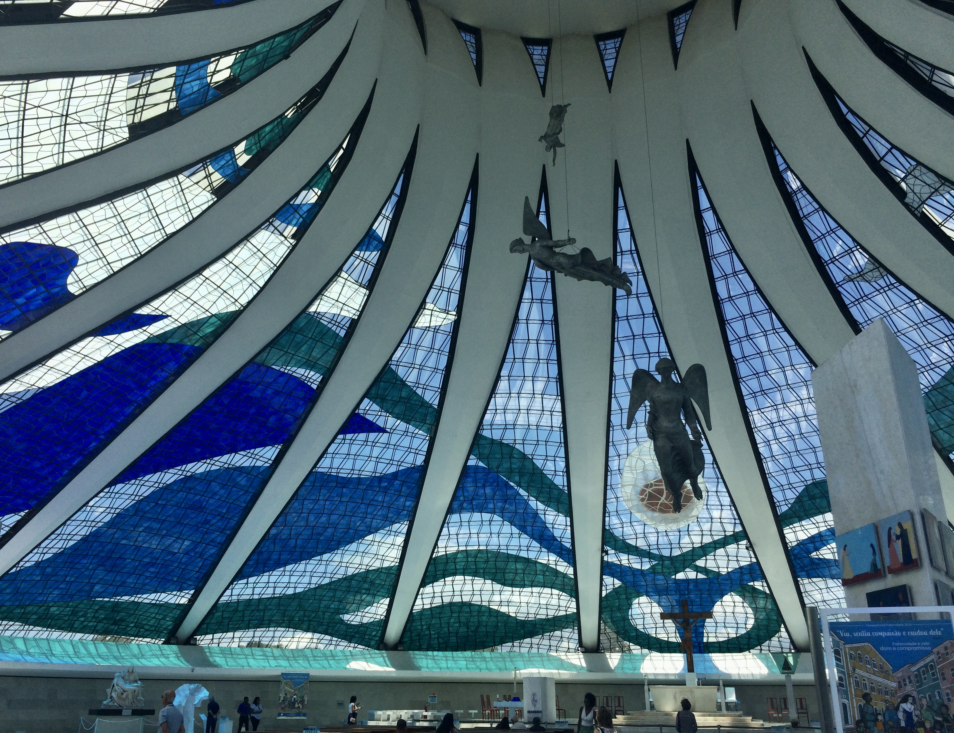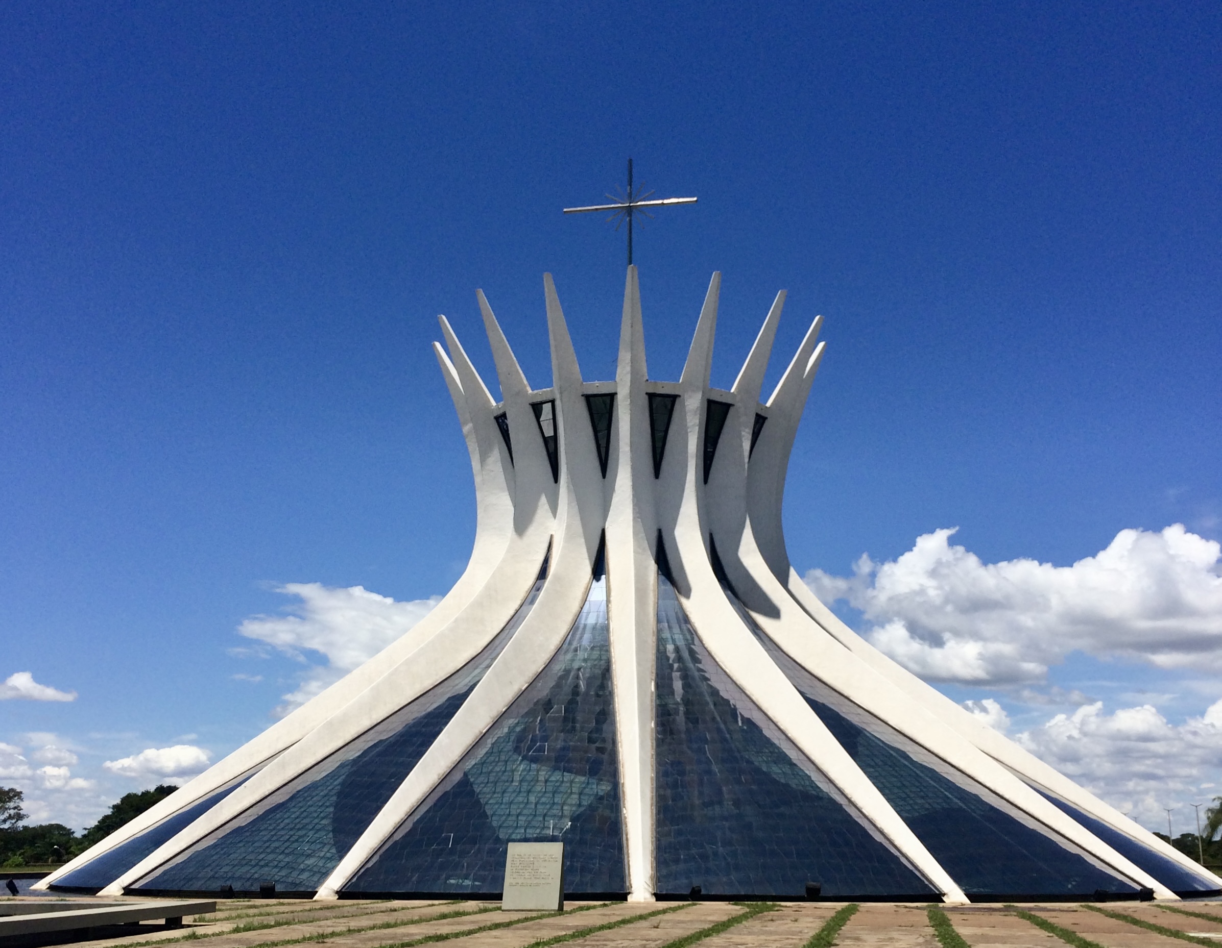 Pour commencer l’article, j’aimerai vous présenter l’édifice phare de la capitale – et mon préféré, soyons honnêtes – la cathédrale métropolitaine « Nossa Senhora da Aparecida ». Un monument circulaire en béton créé par l’architecte Oscar Niemeyer et l’ingénieur Joaquim Cardozo, entre 1959 et 1970, dont la forme extérieure peut faire penser à deux mains jointes ou à la couronne d’épines de Jésus Christ.
