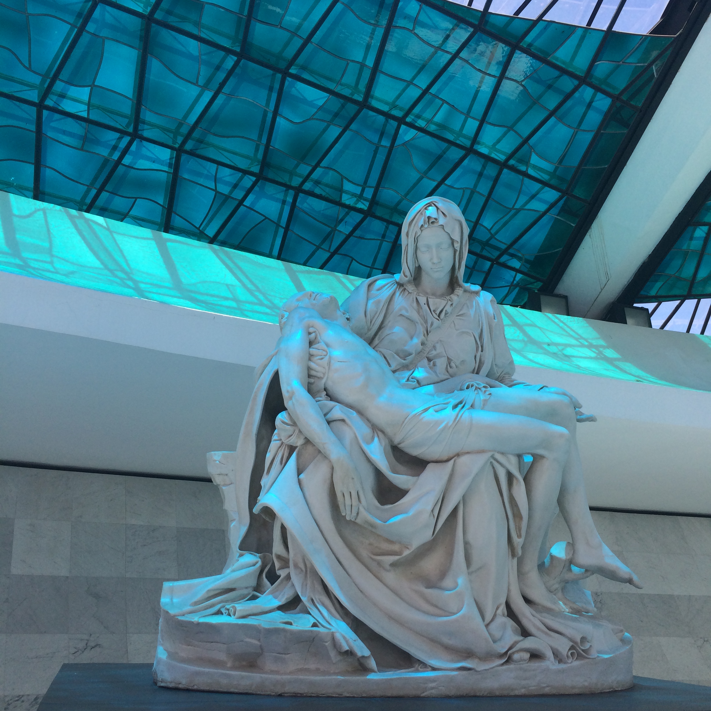 Si l’aspect extérieur renvoie une certaine modernité et sobriété, l’intérieur de l’édifice est frappant par le camaïeu de bleus reflété par les vitraux, recouvrant une superficie de 2000m2. Ces derniers étaient au départ incolores, mais l’ajout des différentes teintes de ces fibres de verre nous plongent presque dans un monde sous-marin aujourd’hui. Des sculptures d’anges sont suspendues au plafond et semblent protéger et voler au-dessus des fidèles, alors qu’une réplique de la Pièta de Michel-Ange se tient plus loin à gauche de l’autel.