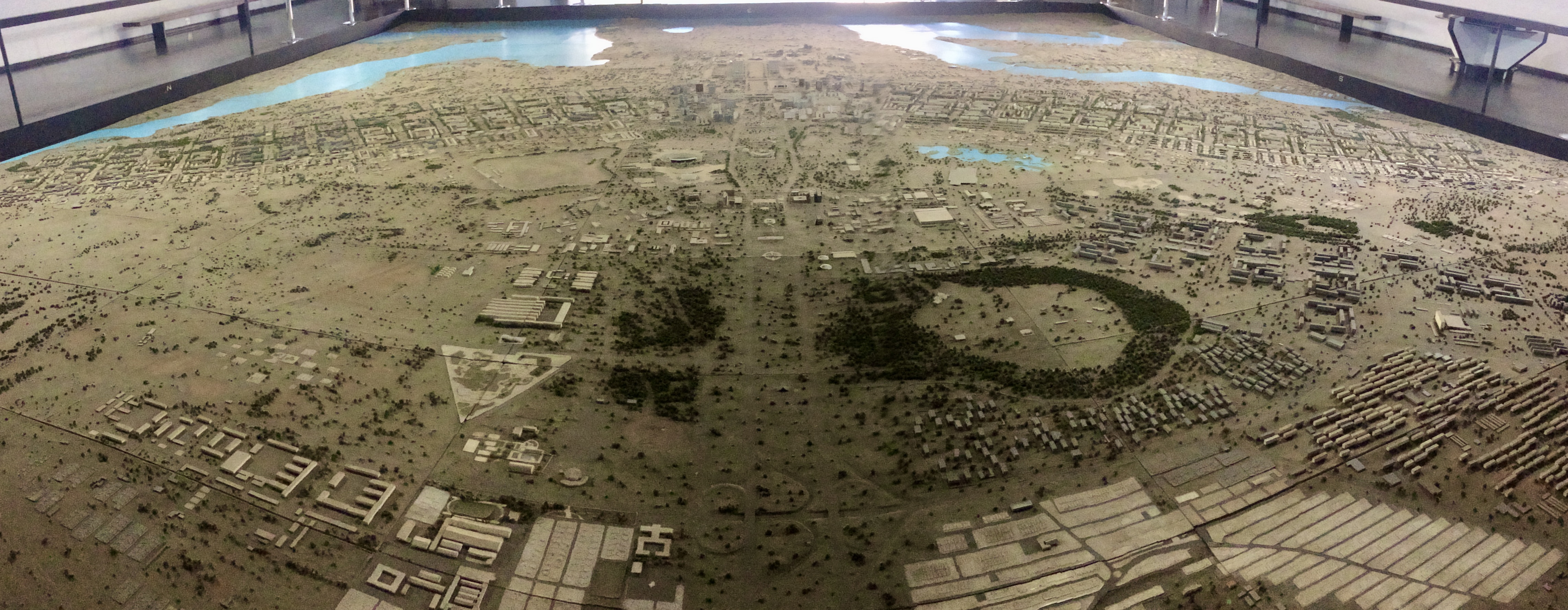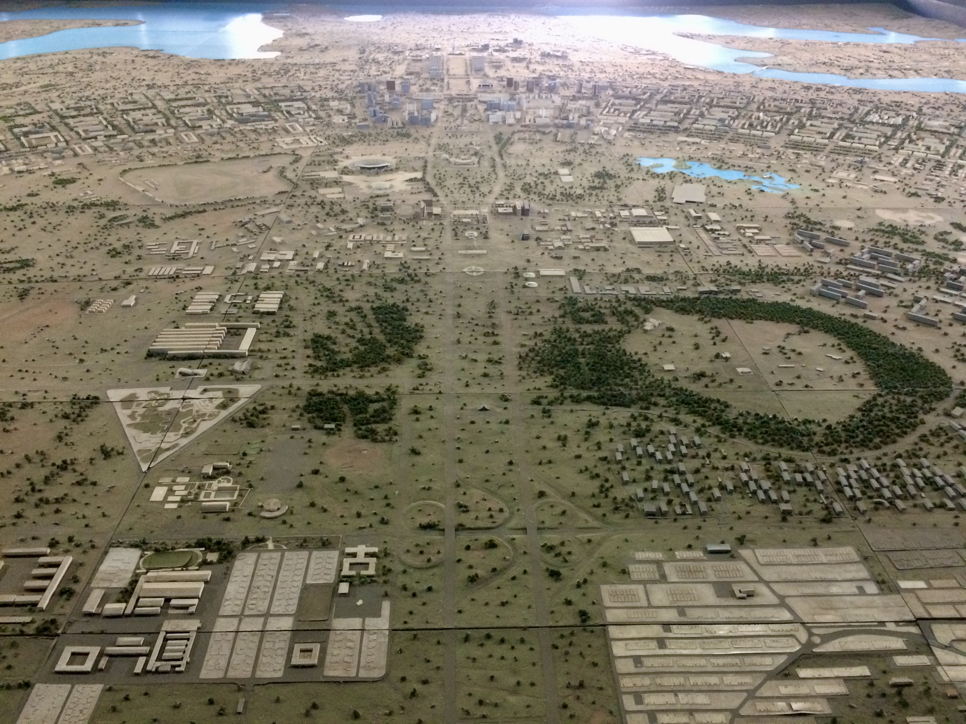 Pour terminer sur cet immense axe architectural, je vous conduis sous la place des Trois Pouvoirs, dans l’Espace Lúcio Costa qui explique la construction de la ville à l’aide de différents plans et d’une immense maquette au sol représentant la forme du plan pilote, ou de l’avion. Lúcio Costa est l’urbaniste à l’origine de l’élaboration de la capitale, dans le but de mieux répartir les richesses et la population, alors concentrées sur les côtes, entre Rio de Janeiro, capitale politique et culturelle, et São Paulo, capitale économique. Un concours est alors lancé, d’après la volonté du président Juscelino Kubitschek en 1956.