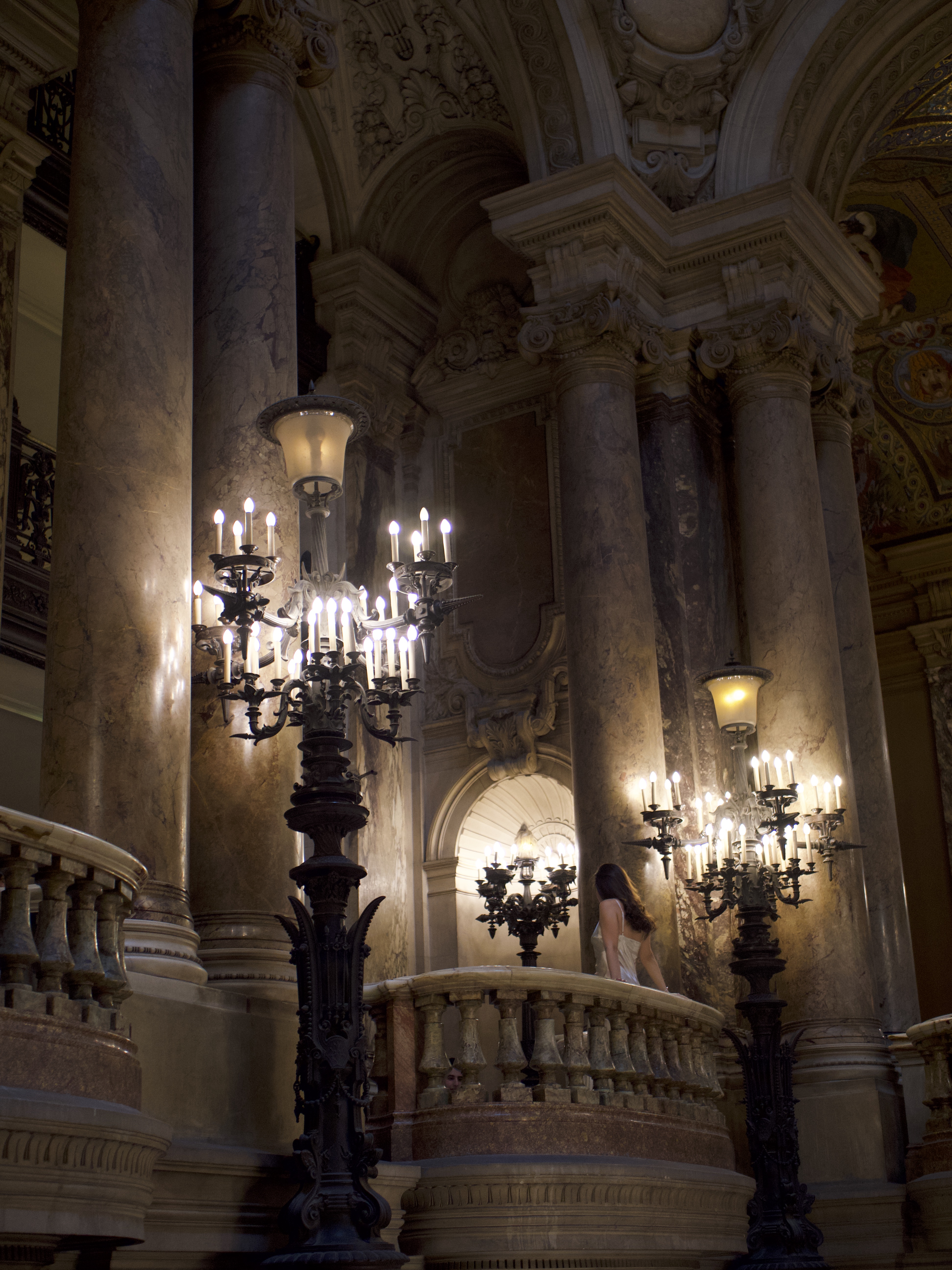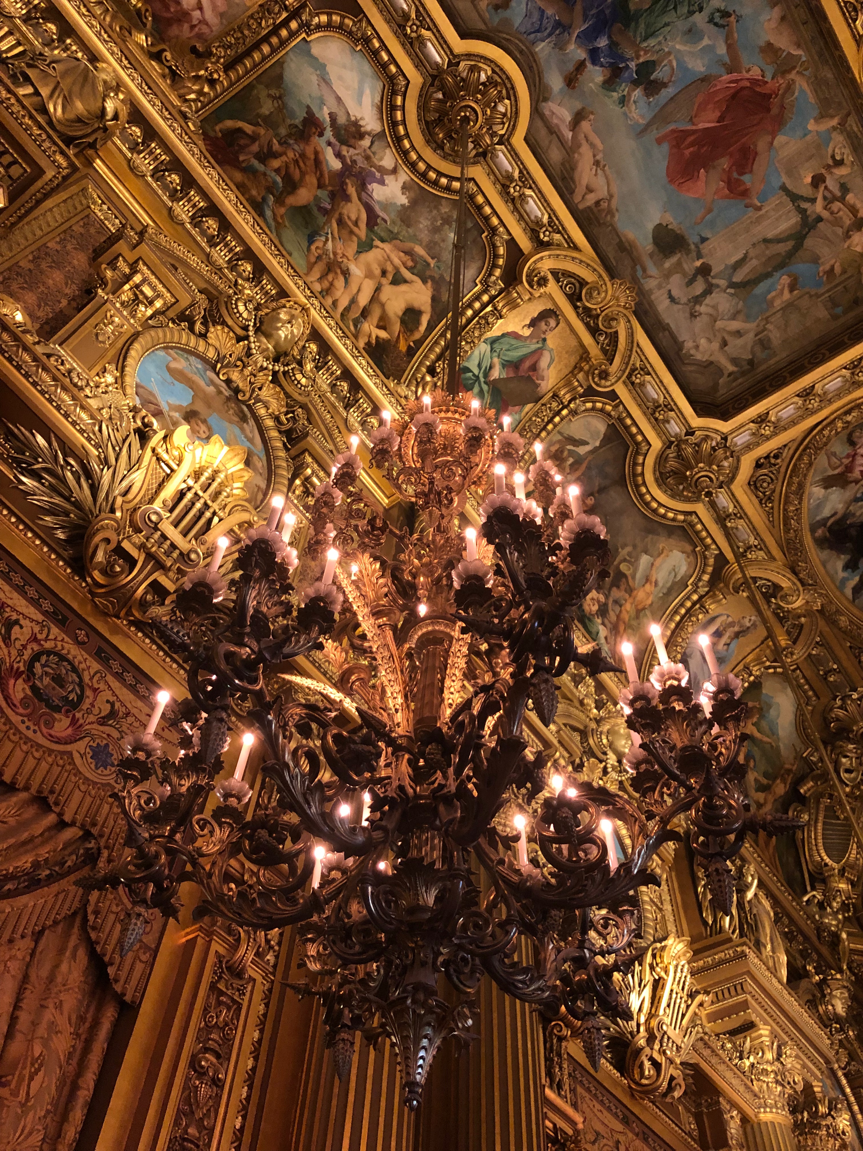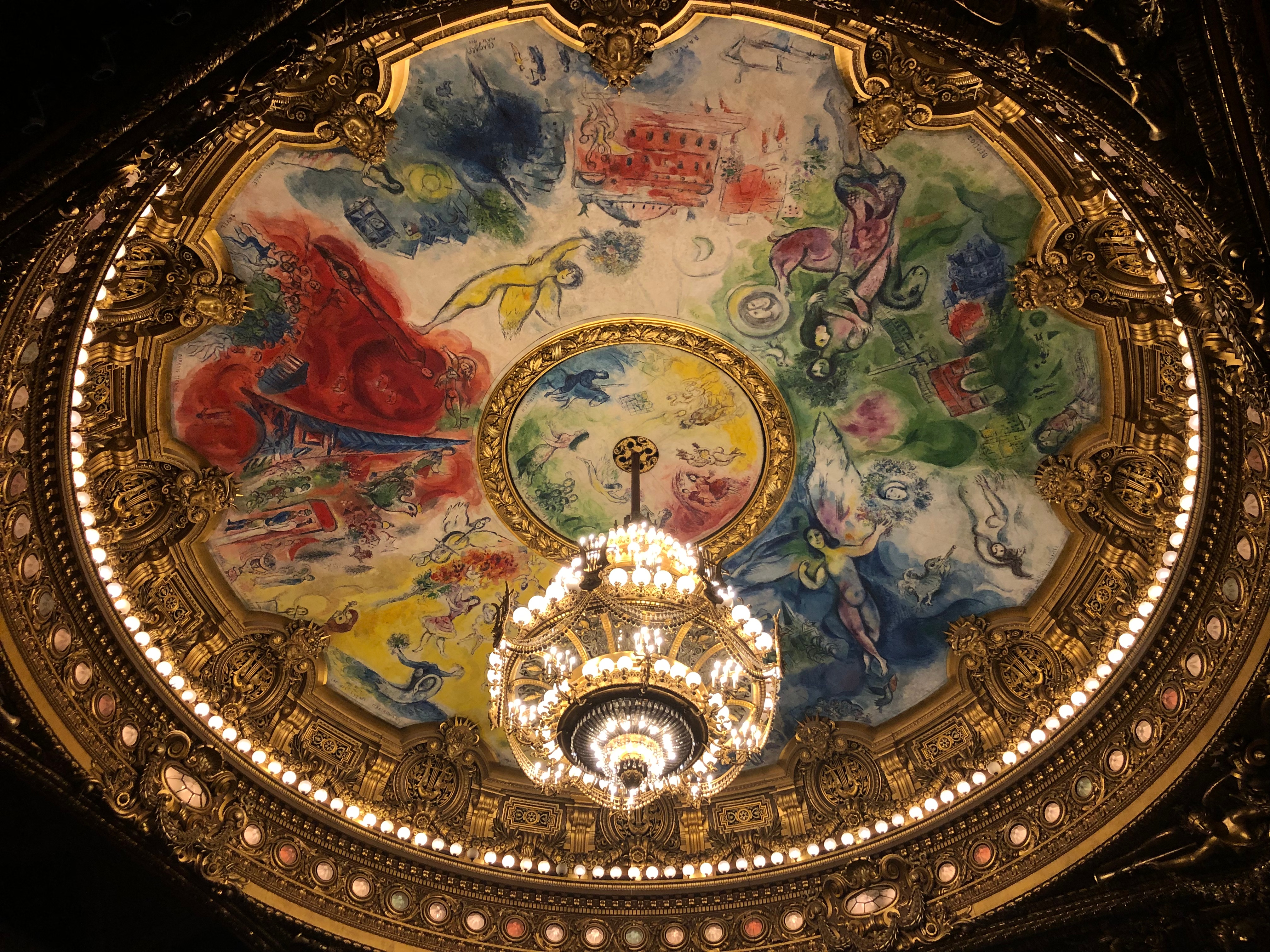 En effet, on est de suite submergé par le marbre, les dorures, les peintures jusqu’au plafond, les chandeliers ouvragés et les sculptures en bronze. Pour le dire simplement : ça en jette ! Mais rien de plus normal pour un lieu qui porte haut les couleurs de la représentation théâtrale, du récit lyrique et de la danse. En entrant dans la salle de spectacle – si elle n’est pas occupée pour des répétitions – la couleur bordeaux du velours des sièges nous enveloppe et notre regard est inévitablement attiré par le rideau de scène peint en trompe-l’œil, ainsi que par la coupole imaginée par Chagall en 1964, rendant hommage à quatorze compositeurs marquants.