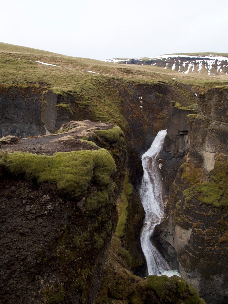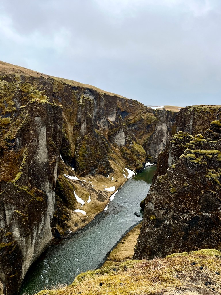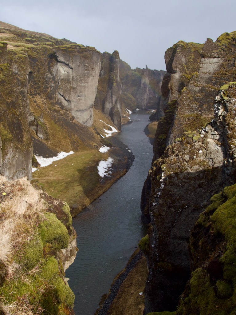 Plus loin, les couleurs se déclinent en une immense palette au canyon Fjaðrárgljúfur, une crevasse s’étirant sur 2km de long pour une hauteur de 100m. Une balade facile et bien aménagée permet de se rendre aux points de vue variés sur cette brèche, avec au fond une cascade. Attention pour ceux qui ont le vertige, les plateformes sont en caillebotis et s’avancent au-dessus du vide !
