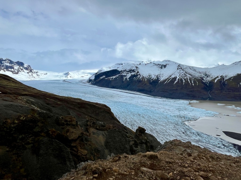 Ensuite, prenez la direction du parc national de Skaftafell tout en longeant les nombreuses autres langues glaciaires depuis la route. Ce parc est le plus apprécié du pays par les randonneurs et, de nouveau, on retrouve un peu de végétation. En se garant au centre des visiteurs, différents départs de sentiers sont possibles, mais, s’ils sont praticables, je vous conseille les chemins S5 et S6 pour atteindre le point de vue Sjónarnípa au-dessus du Skaftafellsjökull. Il existe également une plus grande boucle incluant le point de vue et menant ensuite jusqu’au sentier des cascades de Svartifoss et Magnúsarfoss, mais comptez environ 9km et 4h pour effectuer le tour.
