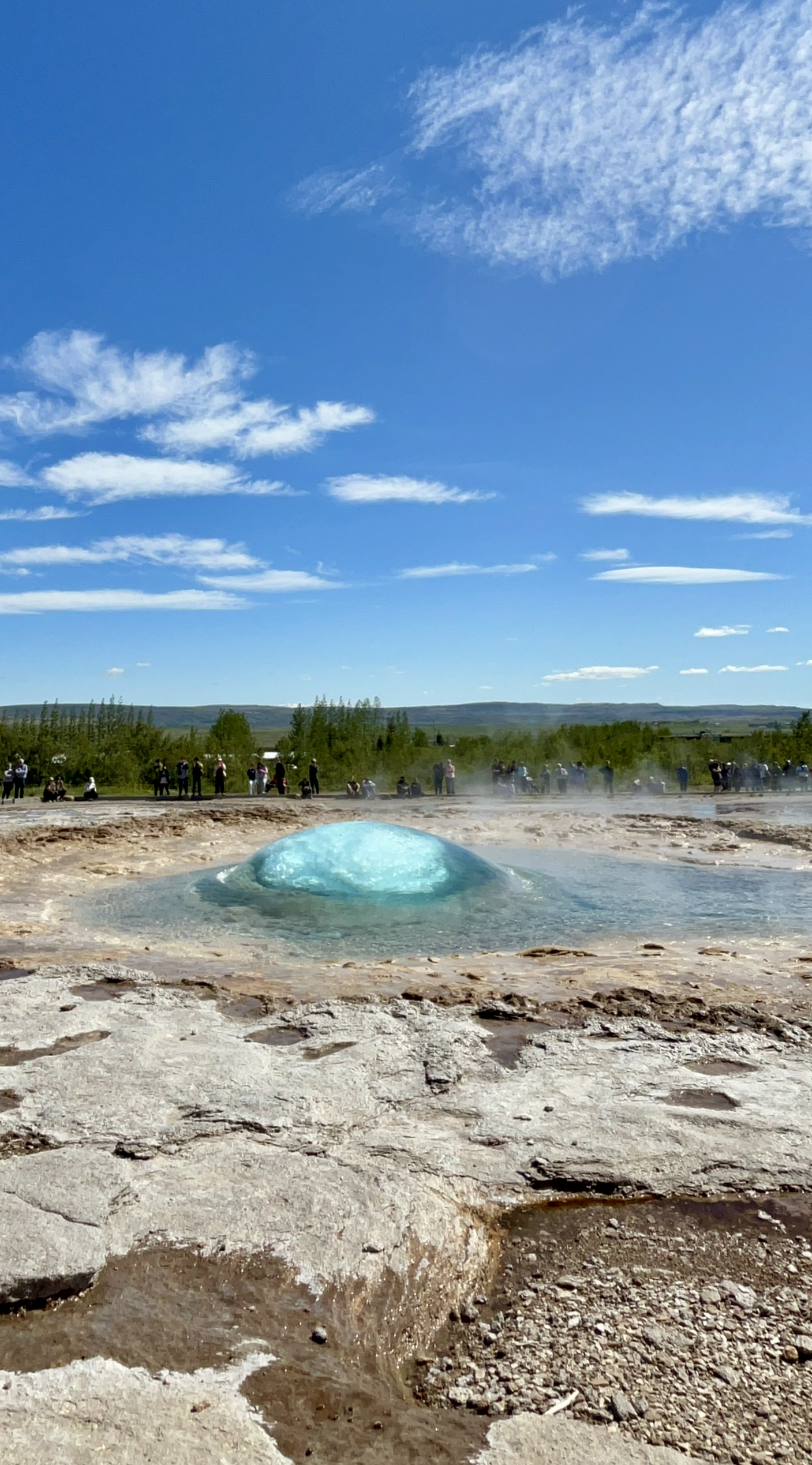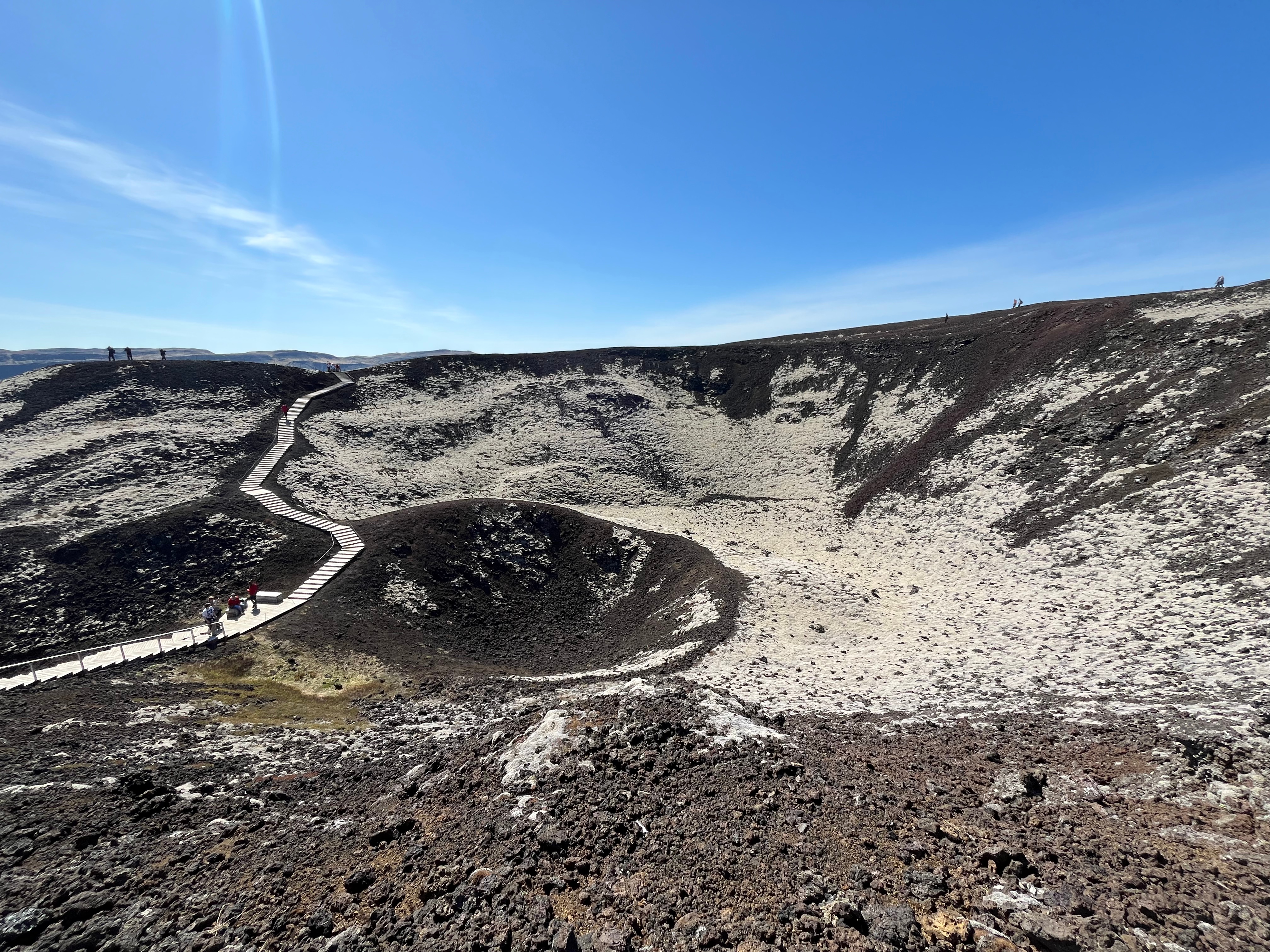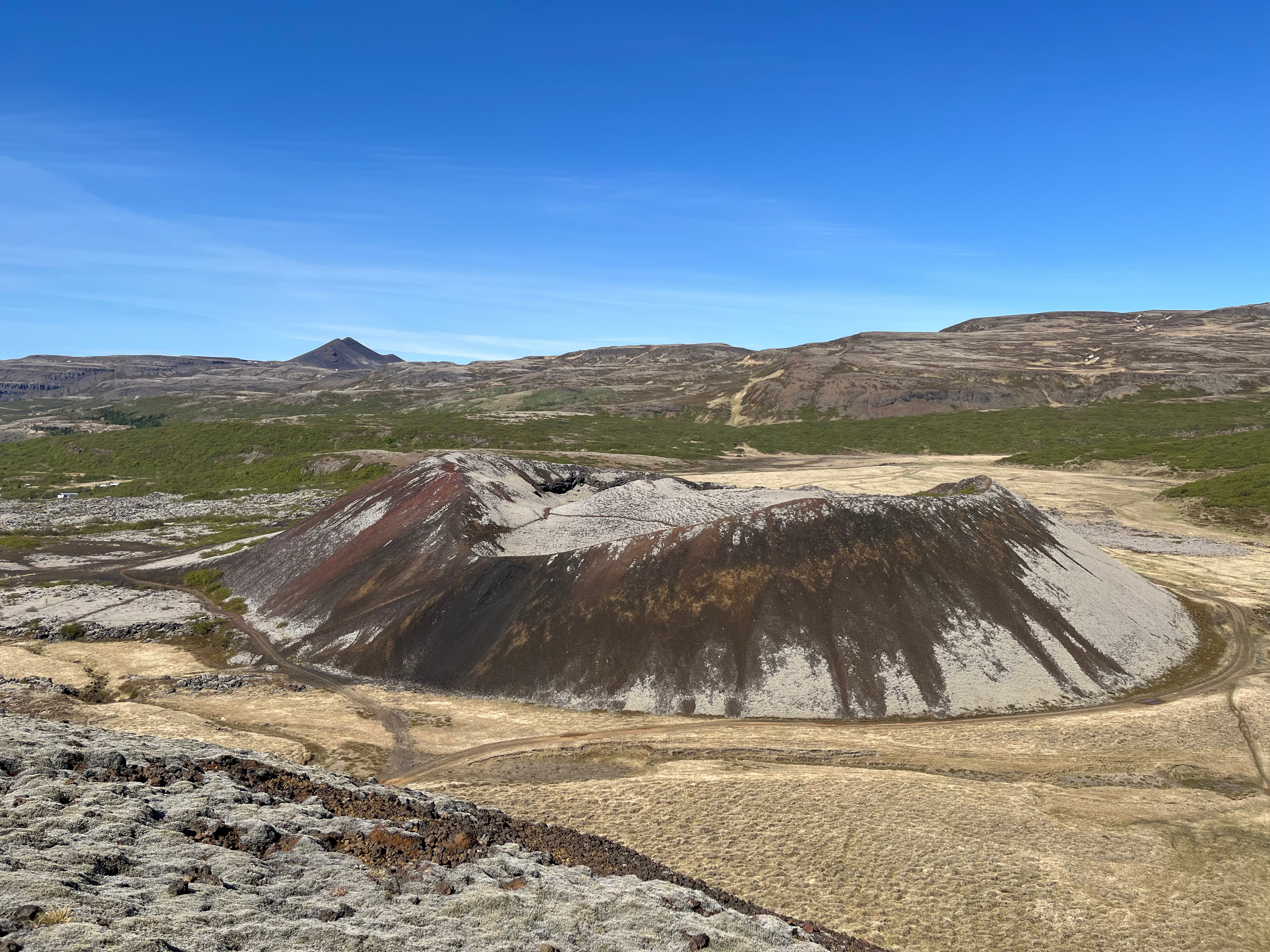 De plus, témoin de cette intense chaleur émanant du sol, faites un détour par la plus puissante source chaude d’Europe Deildartunguhver. Rejetant une eau de près de 100℃ en surface, ainsi qu’une épaisse vapeur sentant le soufre, la source est un don précieux pour la région ouest de l’Islande, puisqu’elle alimente des villes à plusieurs dizaines de kilomètres comme Borgarnes et Akranes. Bien sûr, elle fournit également en eau chaude le centre thermal voisin de Krauma. Poursuivez votre trajet en reprenant la route 1 et arrêtez-vous après le village de Bifröst, aux cratères de Grábrók. Ici, une ascension est possible grâce à l’aménagement du sentier en escaliers pour atteindre le sommet du cratère, culminant à 173m, avec un panorama à couper le souffle sur la région. Enfin, terminez votre journée avec la traversée du désertique plateau de Holtavörðuheiði qui relie l’ouest de l’île au nord.