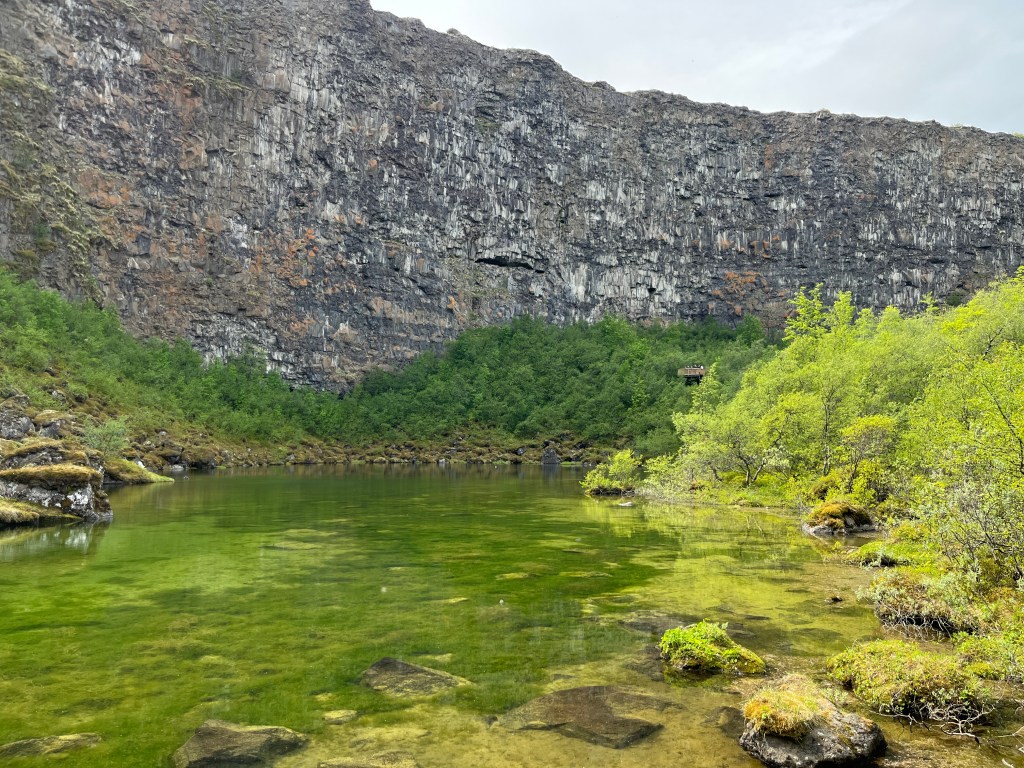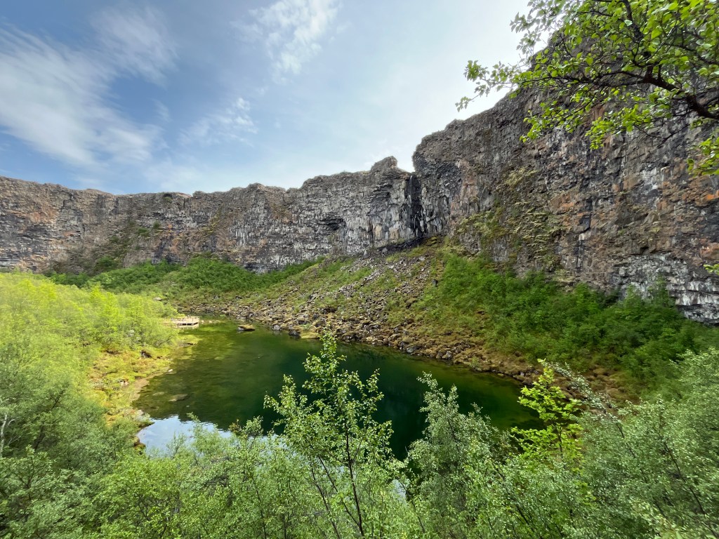 A mes yeux, le nord-est de l’Islande est un peu comme le no man’s land du pays, où il faut faire beaucoup de route pour rejoindre la côte est, mais c’est inévitable. Rendons le trajet plus agréable. Quittez le nord en empruntant les routes 85 et 862 qui permettent d’aborder les sites du jour par l’ouest par des axes praticables. Marquez un premier arrêt en vous enfonçant dans le surprenant canyon d’Ásbyrgi, un lieu déstabilisant à bien des égards. Ce cirque naturel s’est formé par l’ancien passage d’une rivière dont l’érosion lui donna une forme de fer à cheval. La légende raconte qu’il s’agit de l’emprunte de l’un des huit pieds du cheval d’Odin, dans la mythologie nordique. De plus, c’est un endroit apaisant par la présence de végétation, rare sur l’île. Les sous-bois conduisent à un petit lac au fond du cirque qui nous place au pied des imposantes falaises. En repartant, arrêtez-vous au point de vue en hauteur sur les formations volcaniques de Hljóðaklettar pour une photo.