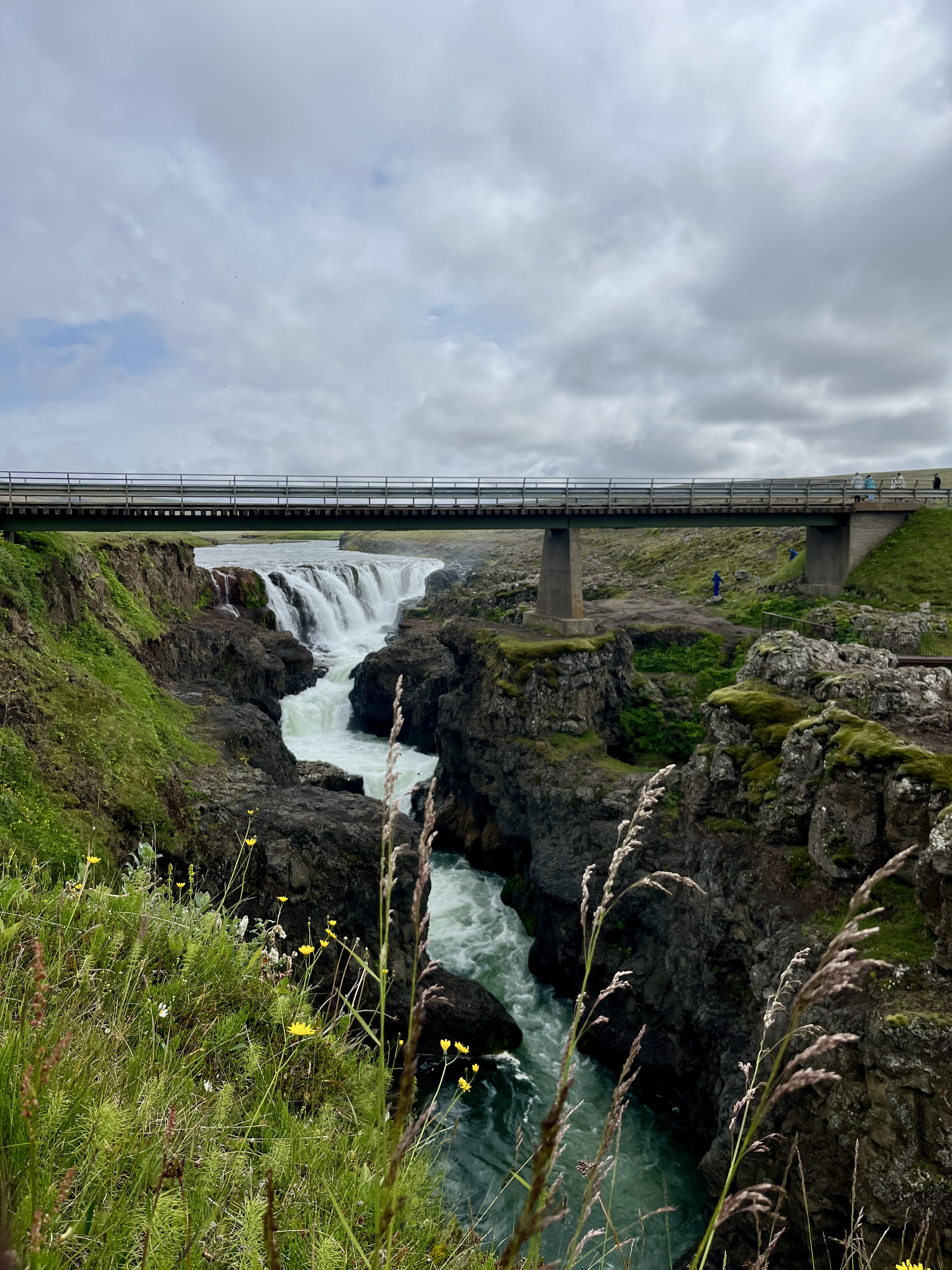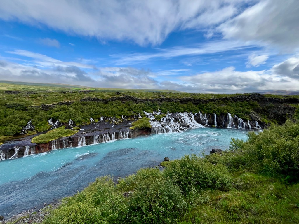 Passer la nuit dans la région autour de Borgarnes vous avancera pour cette deuxième journée dans l’ouest du pays, autour du Cercle d’Argent. Ecartez-vous de la route 1 pour emprunter la route 50 et les petites voies secondaires, en direction des cascades de Hraunfossar et Barnafoss. Logées toutes deux sur le même site de visite, des passerelles et aménagements vous mèneront à ces perles cachées en retrait des grands axes. Les surprises de la Terre nous offre un contraste de couleurs indescriptible entre le vert de la nature et le bleu glacial de l’eau qui jaillit par capillarité de la lave noire. Littéralement appelée la cascade de lave, Hraunfossar est, pour moi, l’une des plus belles chutes du pays, malgré la sombre histoire qui se cache derrière ce site.