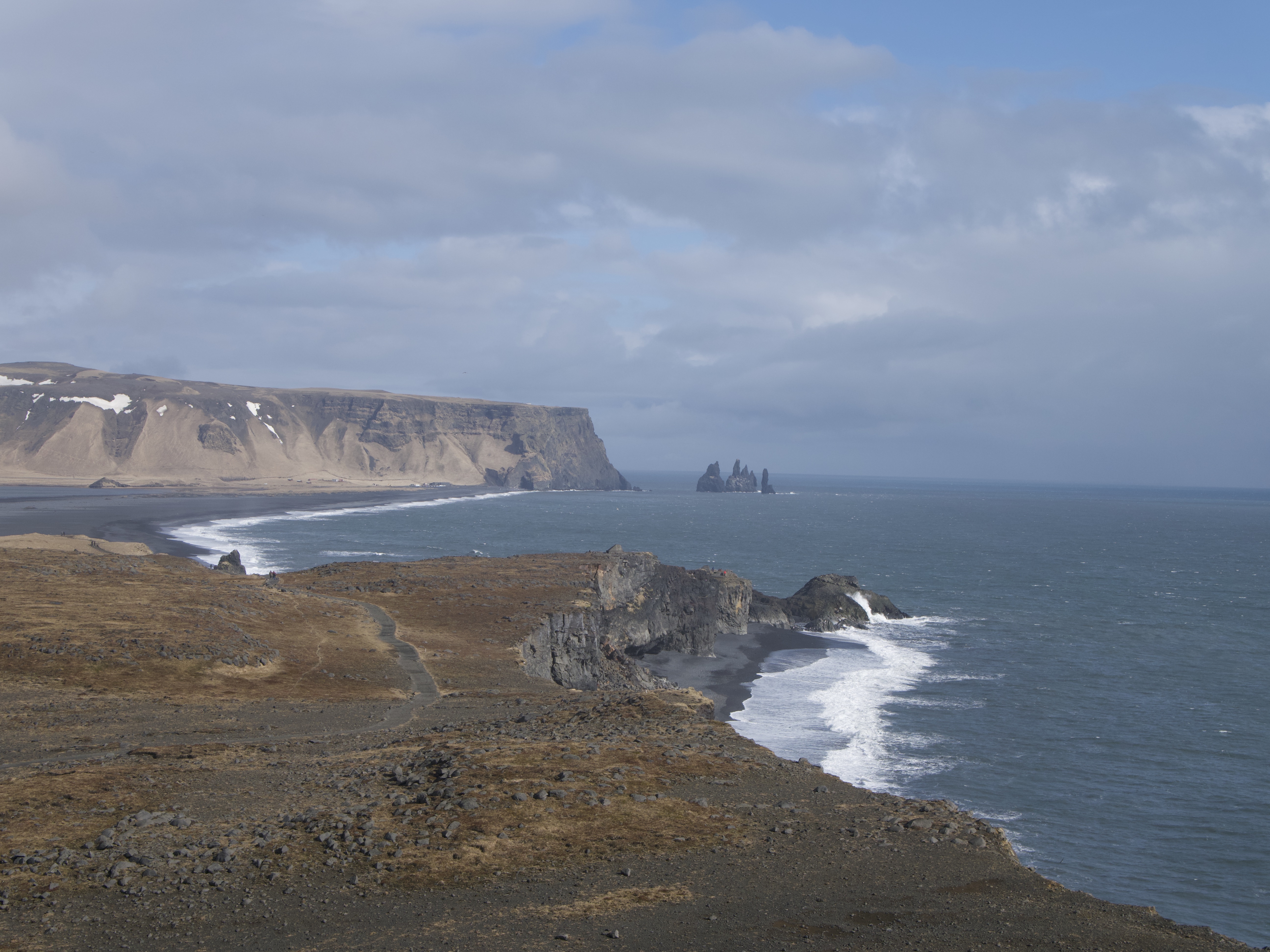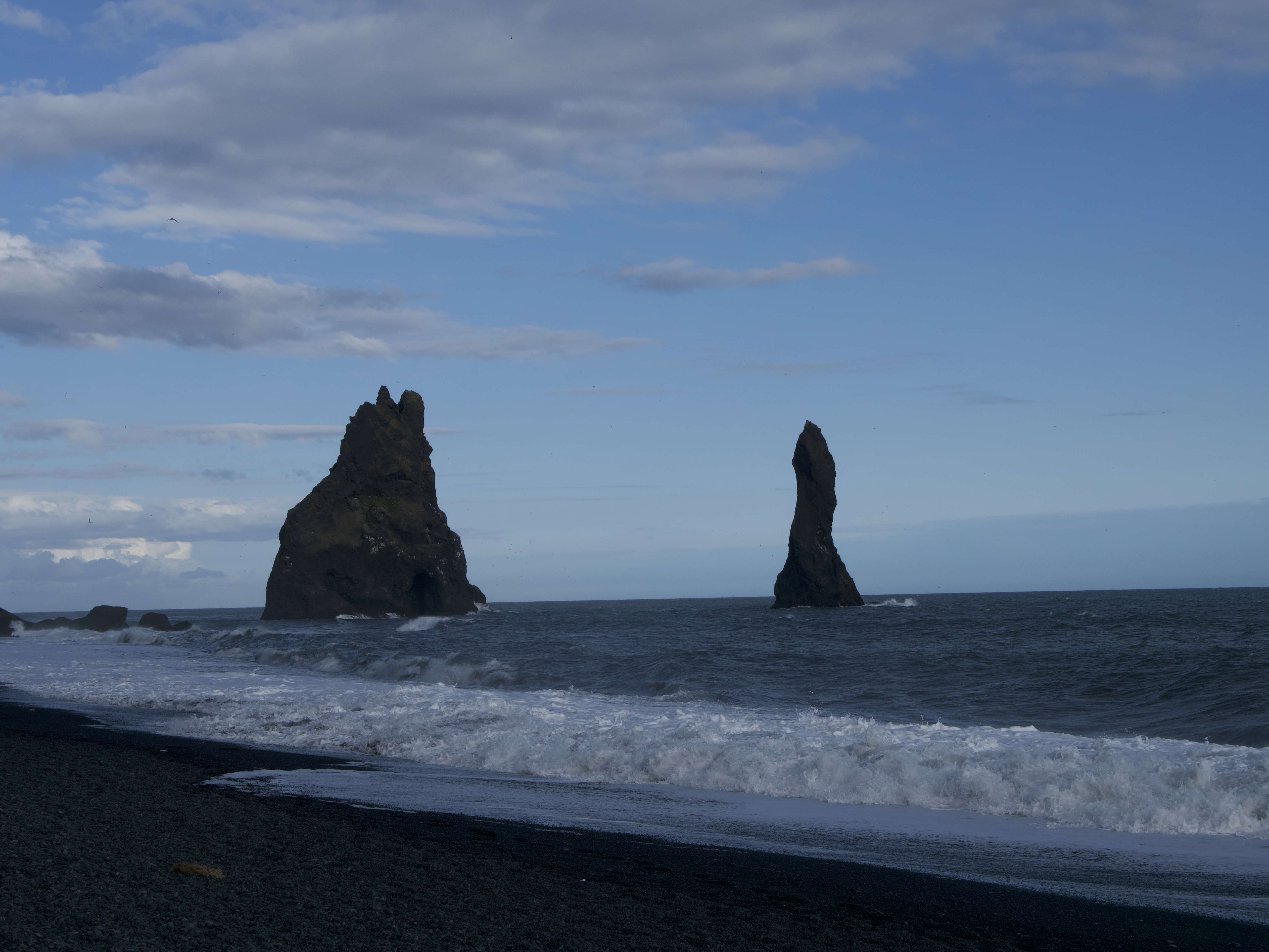 Pour finir, après une bonne nuit dans l’incontournable village de Vík í Mýrdal, cap sur la célèbre mais dangereuse plage de Reynisfjara. Recouverte de sable noir, elle offre un panorama sur les trolls de Reynisdrangar (formations rocheuses dans l’océan), ainsi que sur les falaises ponctuées de belles orgues basaltiques. La plage est réputée dangereuse pour les vagues scélérates qui viennent aléatoirement s’écraser sur le relief et qui remontent haut sur la rive, causant régulièrement des accidents. Pour éviter ces derniers, ne tournez jamais le dos aux vagues, restez à bonne distance de l’océan et respectez les consignes de sécurité données à l’entrée de la plage. Cela reste un bel endroit pour observer les adorables macareux qui nichent au sommet des orgues, lorsque la saison de migration est en votre faveur (mai-août).